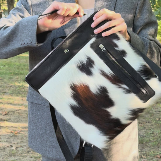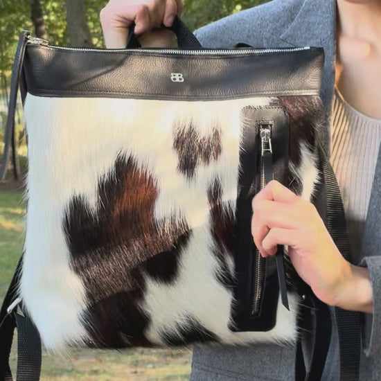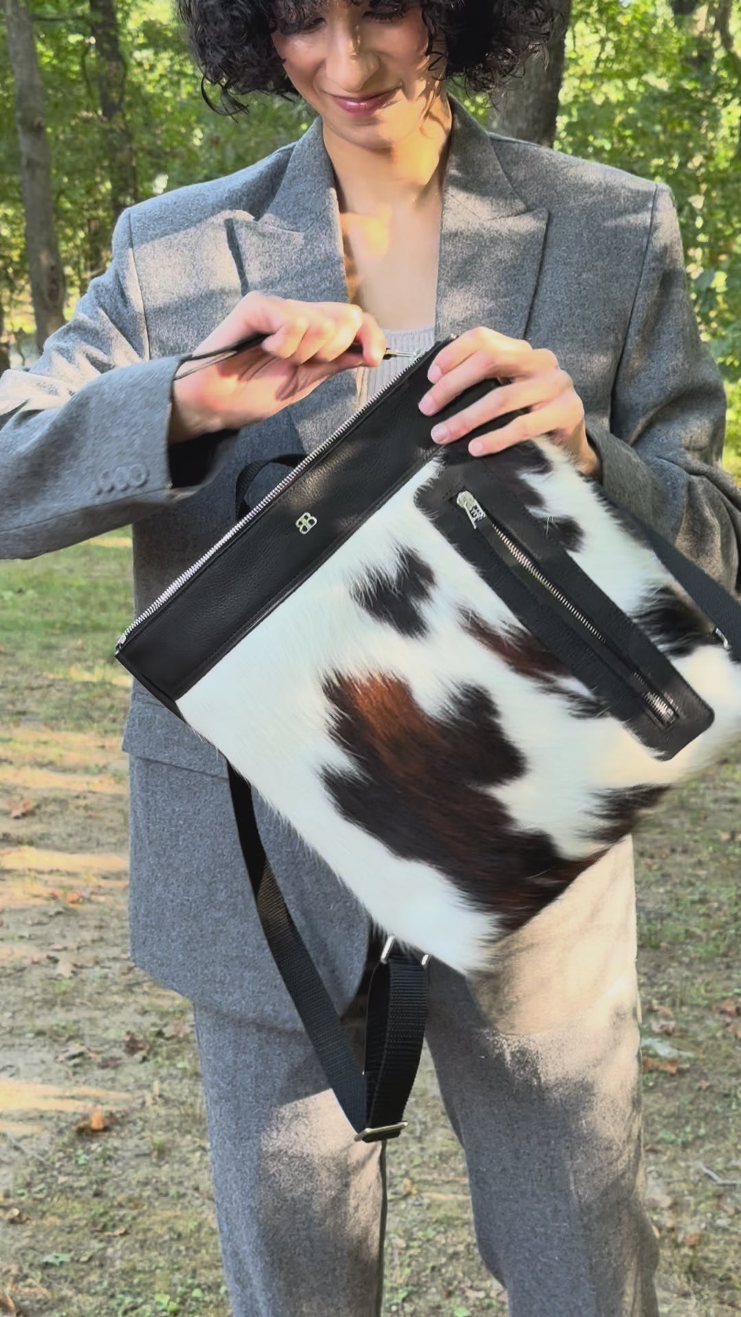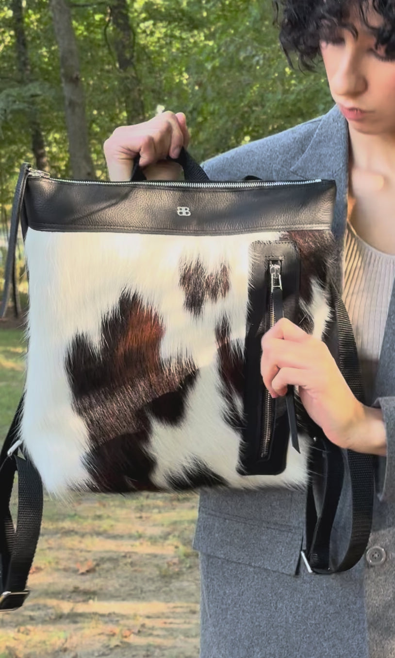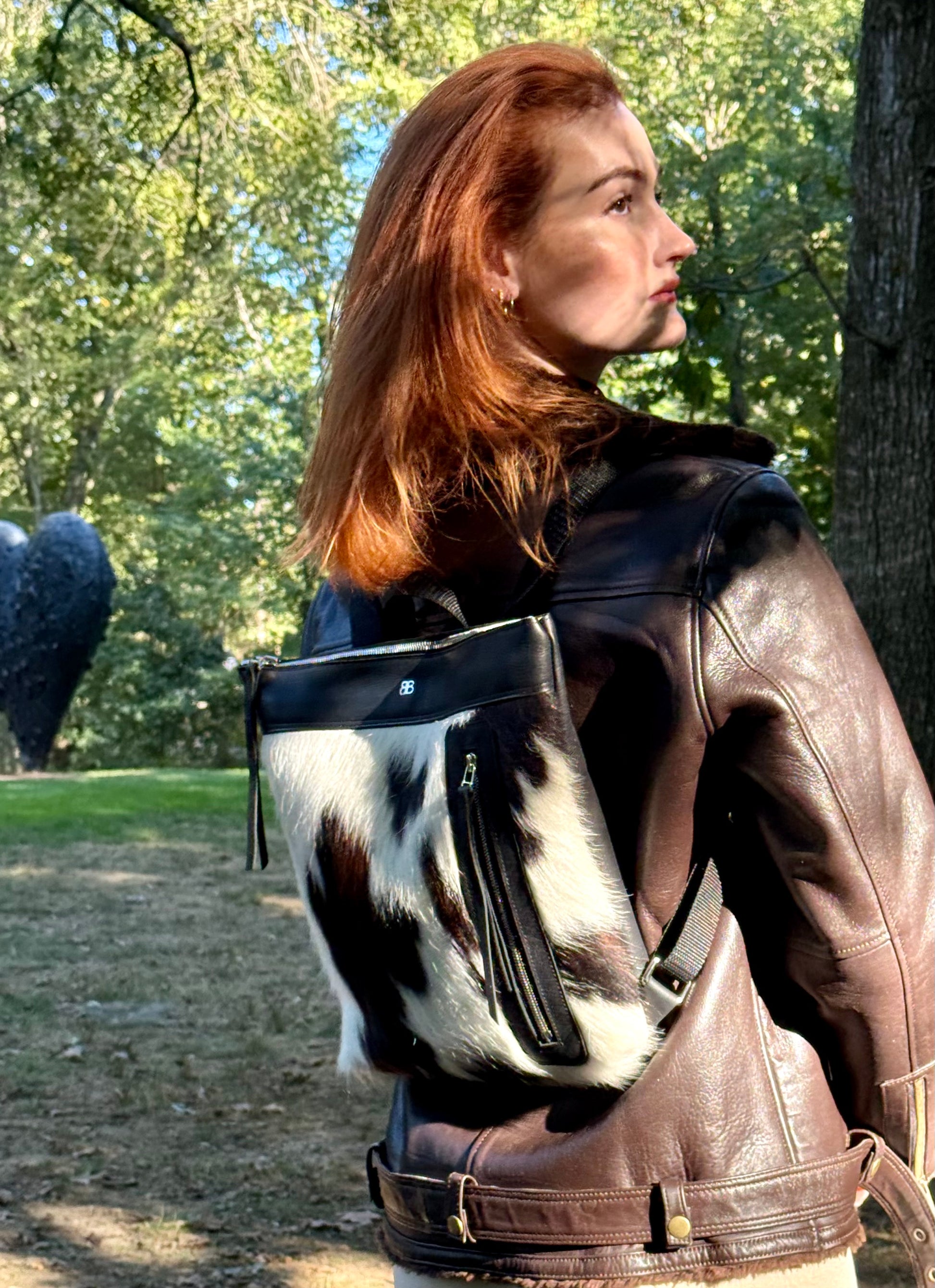 The Denver Backpack in Hairy Cow is a statement unto itself! PRACTICAL and gorgeous at the same time. Hair-on hides are regular leather that still have the hair on, otherwise it's like other leather. The back features Kodiak leather with a large pocket. Adjustable straps are beautiful Horween leather. Zippers and hardware are nickel. Fully hand made one at a time in Concord MA