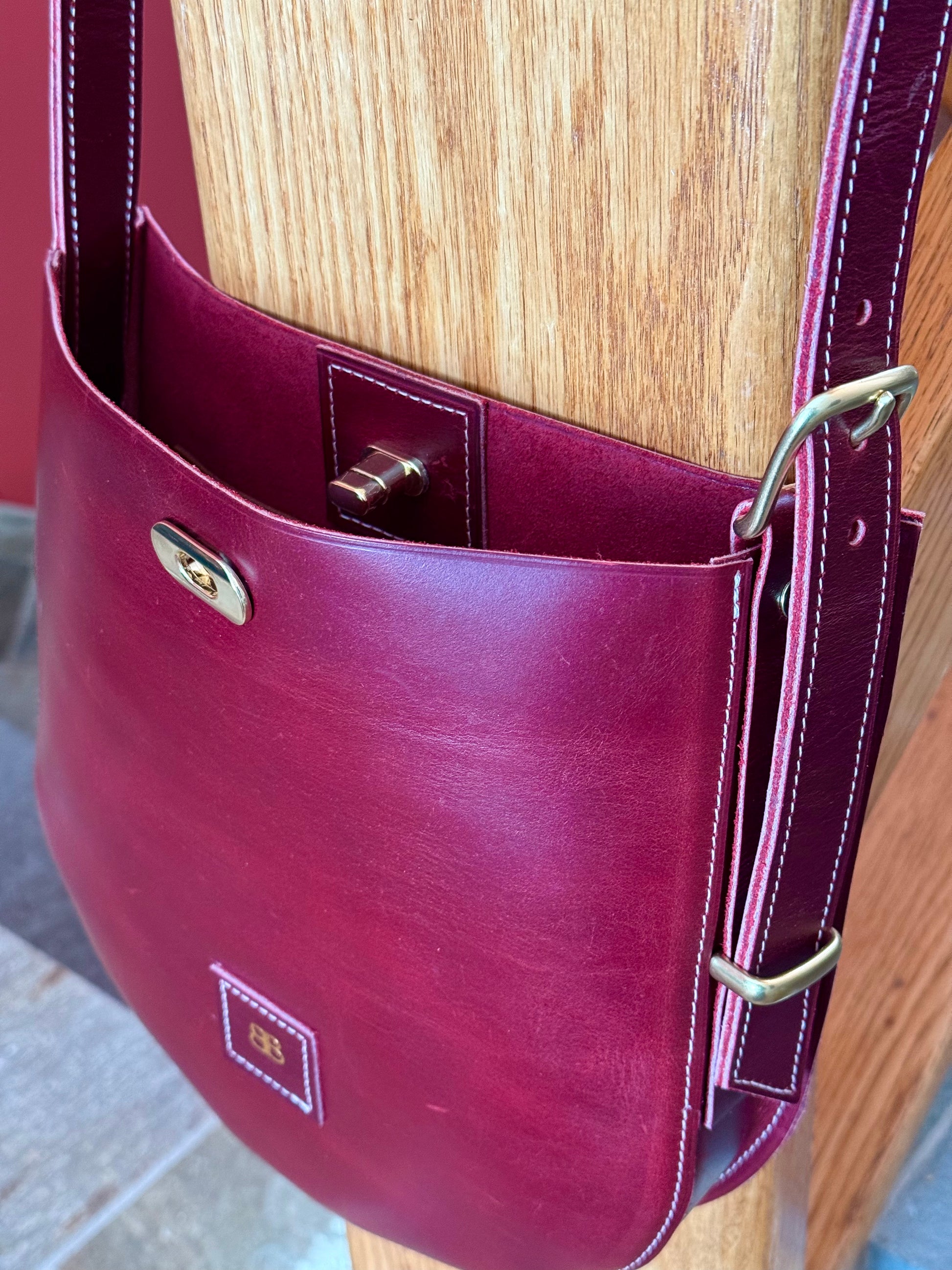 HANNA is sleek and sophisticated and built to last. Unlined maroon cowhide, one slip pocket inside, 1" wide sturdy strap with brass buckle adjustment. Fully hand made in Concord MA.